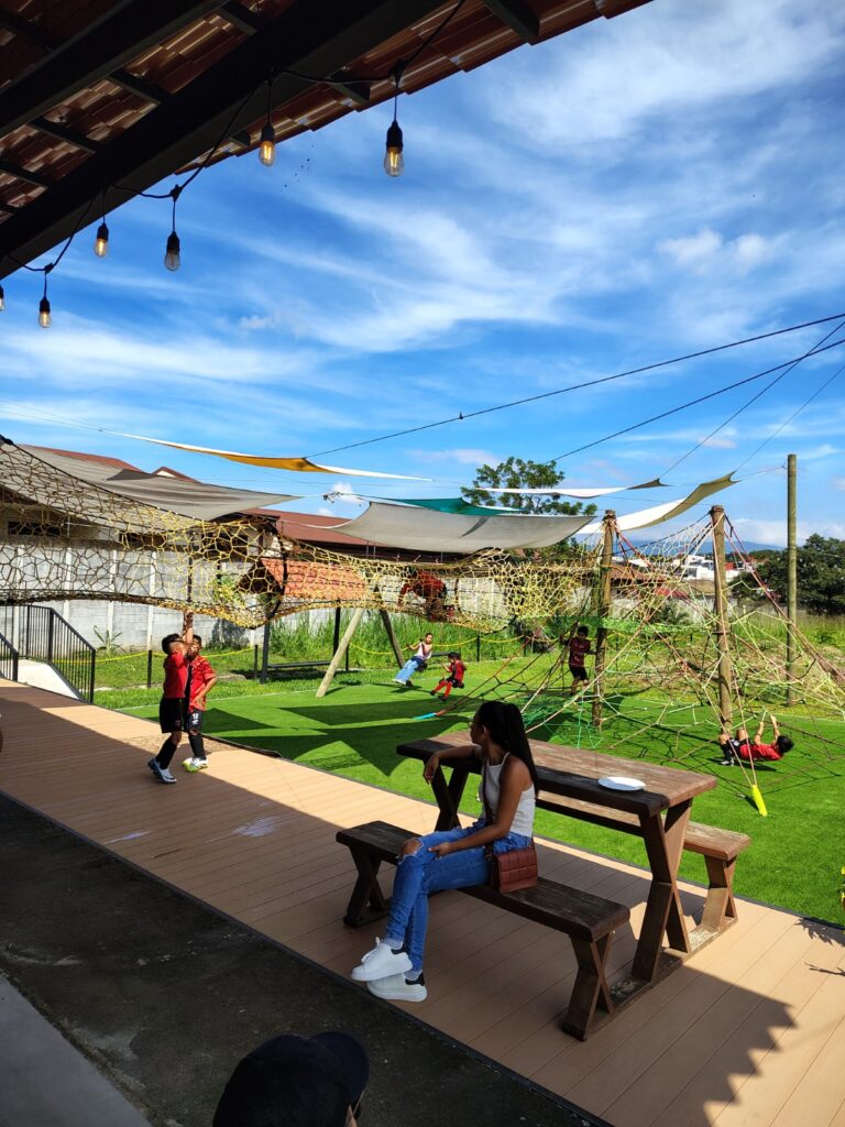 El diseño del lugar permite que los niños jueguen y se muevan con libertad mientras los adultos comparten en las áreas de descanso.